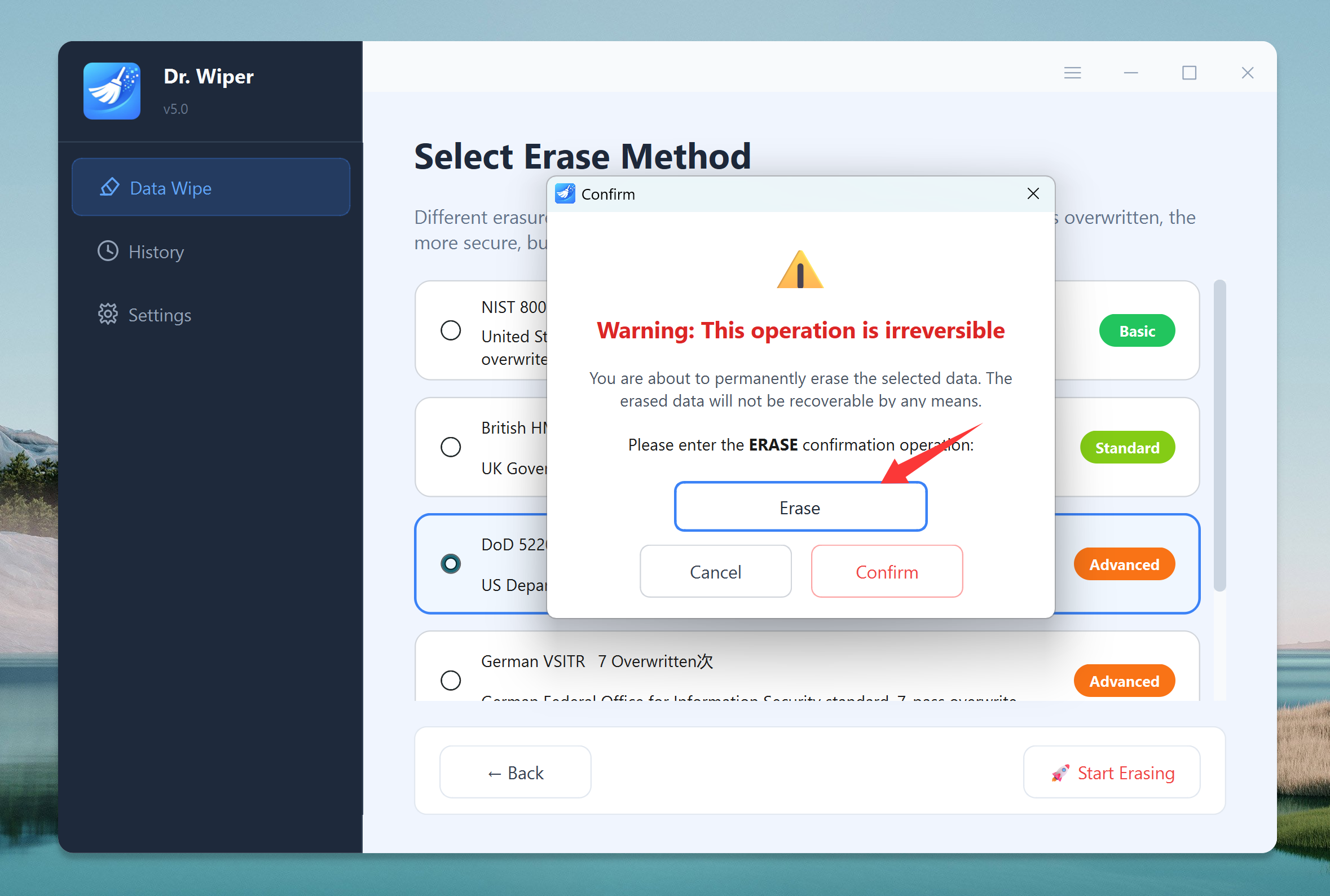 Step 3. Pick an erase method — there are 7 built-in options, including: