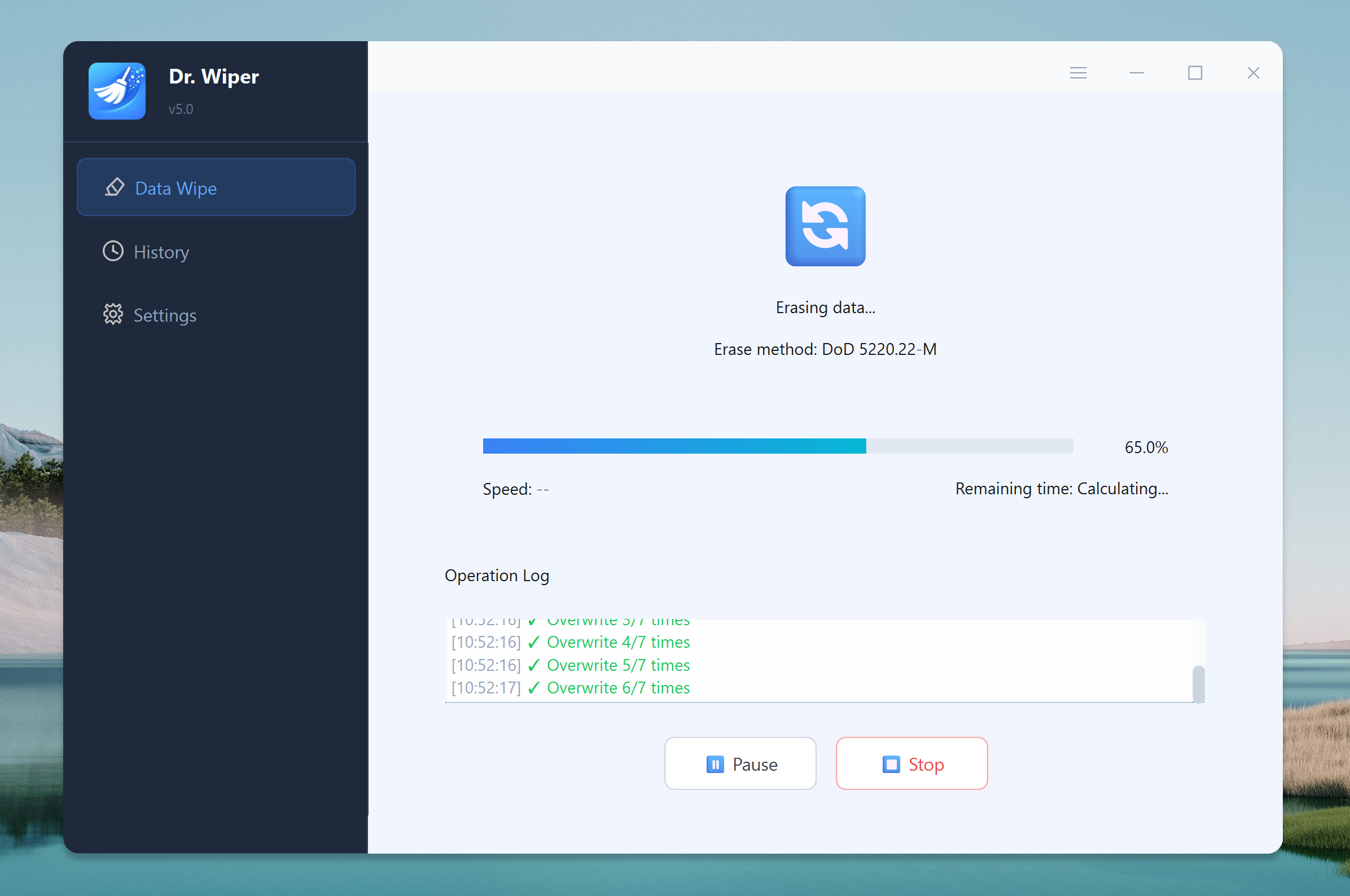 The moment you press that button, Dr.Wiper takes over — no second guessing, no turning back. It begins methodically overwriting every bit of data on the drive using the secure method you picked. You’ll even see a progress bar so you know it’s working (and no, it’s not just deleting — it’s shredding).