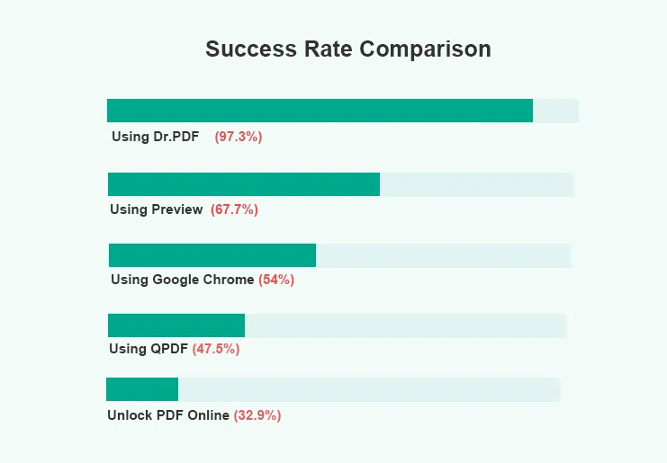 It doesn't matter how long ago your PDF document was protected with a password, and no matter how complex the password is, Dr.PDF can quickly recover your lost PDF password without destroying the original data. In our test, for a 8-digit password length, Dr.PDF can search through 5+ billion records within 3 hours, on average, it performs 60,000 searches per second, you may expect a successfully found password with a 91% probability. The search time may vary depending on the specific hardware, PDF version and software configuration. Conversely, it has an average success rate of 99% in deleting permission passwords.